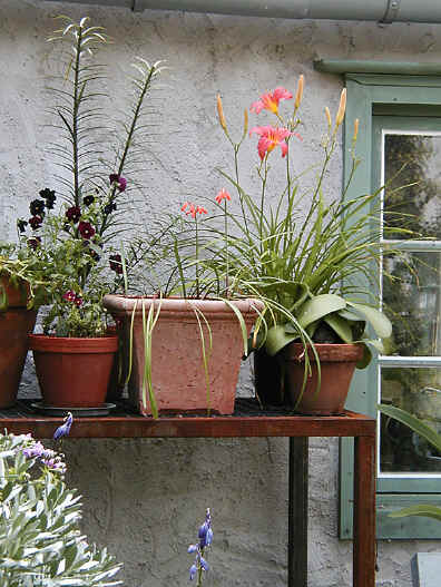 Perenner i krukor. Här kungslilja längst bak och