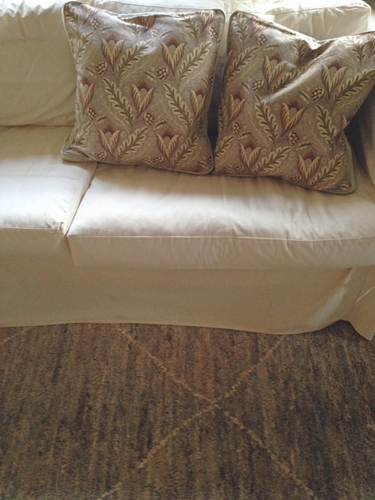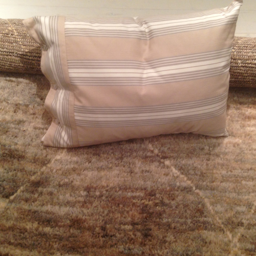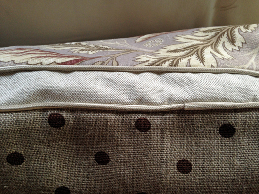 Överst kudde uppsydd i vårt tyg Bolsterrand Panama neutral. Se